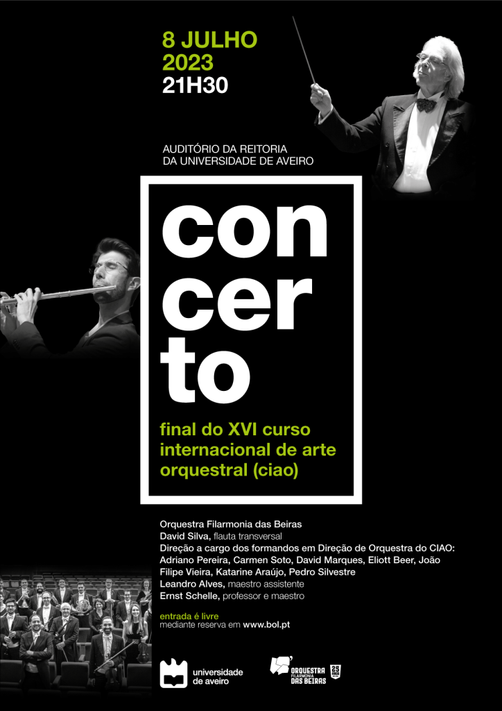 A Orquestra Filarmonia das Beiras apresenta o Concerto Final da XVIª edição do Curso Internacional de Arte Orquestral (CIAO), sob a direção pedagógica e artística do Maestro Ernst Schelle. Acompanhados pelo flautista David Silva, serão apresentadas obras de Beethoven, Fétis, Mendelssohn, Prokofiev e de Stravinski dirigidas pelos maestros ativos deste curso.